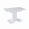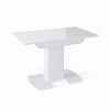 Небольшой раскладной стол для кухни.  Каркас – качественные ДСП, столешница прямоугольной формы из МДФ и матового или глянцевого закаленного стекла имеет размер 110 см, легко раскладывается до 140 см. Опирается стол на одну устойчивую ногу, переходящие в две плоские опоры на полу, что гарантирует устойчивость и надежность конструкции.